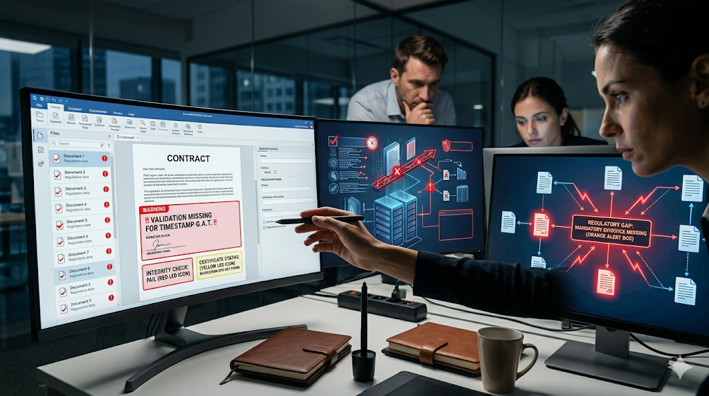 O resultado é previsível: documentos críticos assinados com mecanismos que não suportam uma auditoria mais rigorosa. Funciona no dia a dia. Falha quando precisa ser provado.